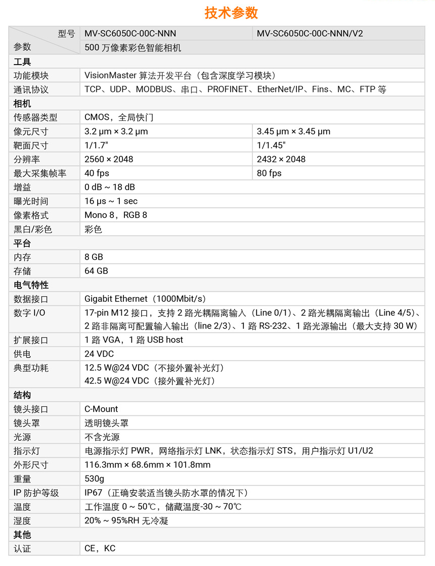 海康SC6050C視覺傳感器功能特性: