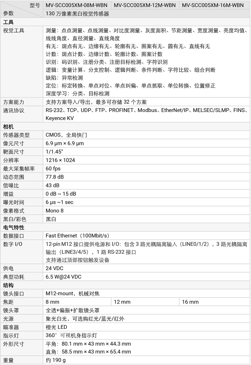 海康威視MV-SCC005XM 視覺傳感器內部植入高精度高效率視覺算法,可實現計數、有無、測量、識別等功能。可通過 SCMVS 進行監視和操作,通過RS-232、以太網輸出工具結果,通過 IO 與上下游工序配合。支持視覺工具多種結果輸出以及自定義結果文本輸出。
