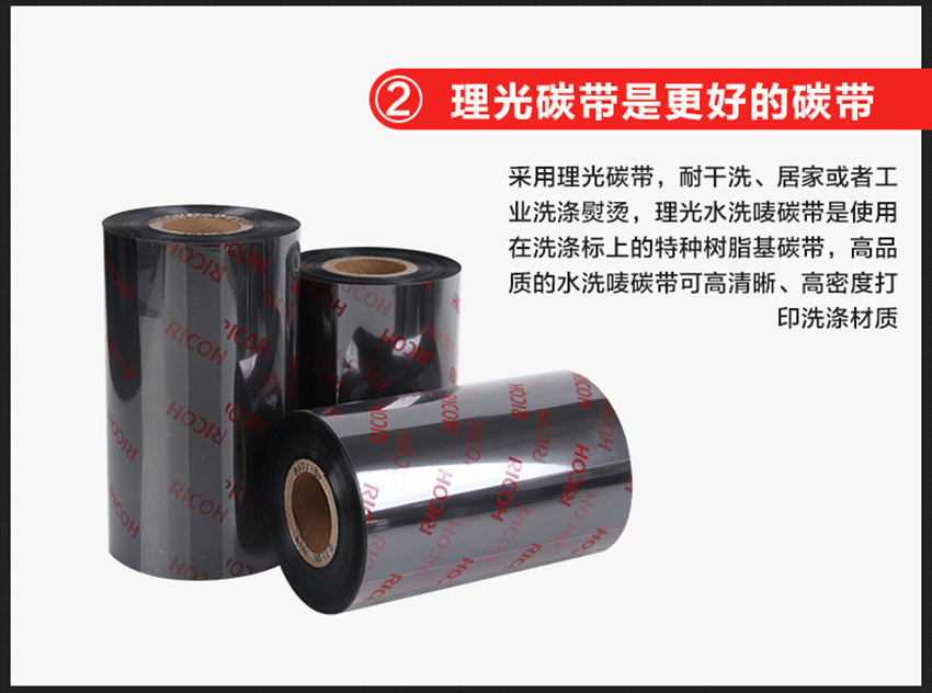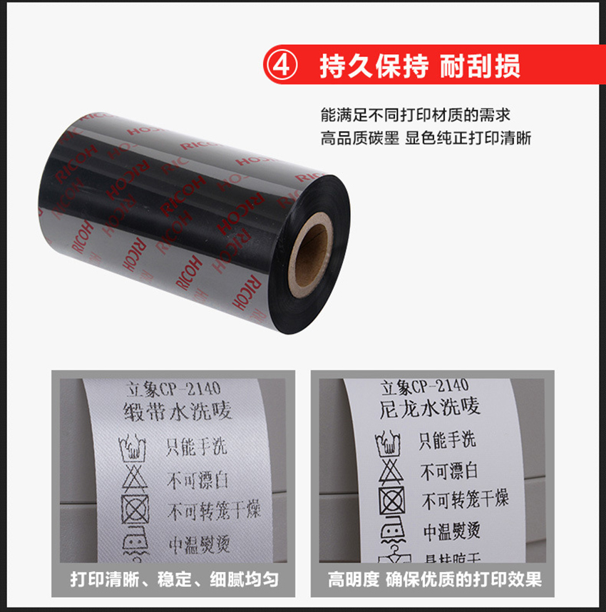 注:此款D110C為全樹脂水洗專用碳帶,適用于服裝水洗嘜、尼龍標簽。