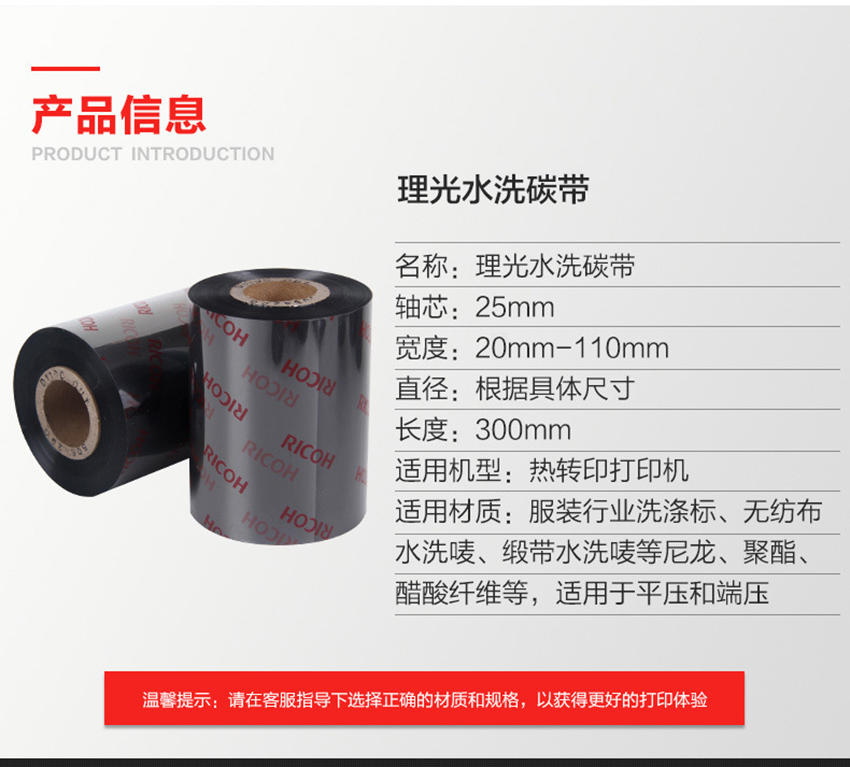注:此款D110A為全樹脂水洗專用碳帶,適用于服裝水洗嘜、尼龍標簽。