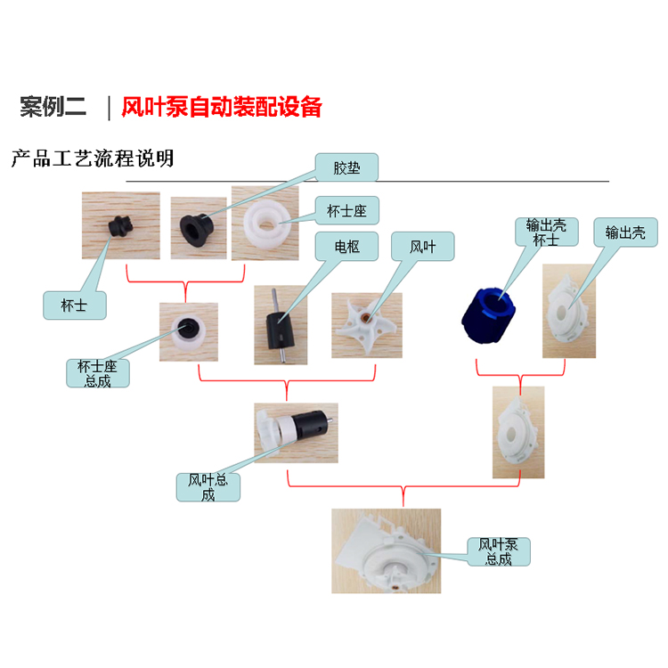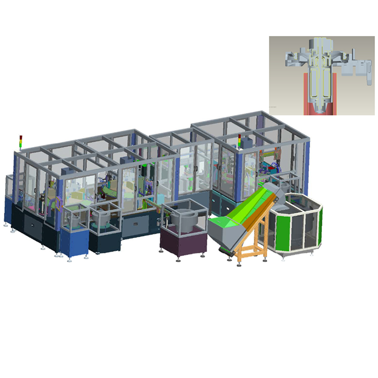 該設(shè)備自動(dòng)完成風(fēng)葉泵的自動(dòng)化裝配,設(shè)備配備了杯士上料噴油、O型圈上料噴油、杯士座上料噴油、杯士組件壓裝及高度檢測(cè);電樞上料及噴油、風(fēng)葉上料及壓裝、風(fēng)葉高度檢測(cè)、電樞及風(fēng)葉組件充磁;輸出殼上料及噴油、輸出殼杯士壓裝及高度檢測(cè),風(fēng)葉組件及輸出殼壓裝,最后通過(guò)高度檢測(cè)及CCD檢測(cè)自動(dòng)判定良品與不良品。合格產(chǎn)品自動(dòng)輸送到成品盤。